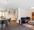 • Bright and airy living room with large sliding glass doors leading to a balcony or terrace, hardwood floors, and exposed wooden beams in the ceiling.