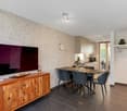 • Open living room space with a couch, wooden coffee table, and a view of a balcony with trees and mountains