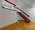 • modern attic room, white walls, tiled floor, wooden railing, large skylight