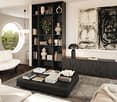 • modern design, white cabinets, black granite countertop, black integrated oven, stainless steel sink