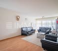 • Spacious open-plan living area with hardwood flooring, white walls, large windows, modern TV unit, grey sofa, red accent chairs, and a dining area visible in the background.