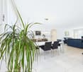 • Large kitchen with modern cabinets, white tiles, integrated oven and microwave, sliding glass doors, windows, sun-lit