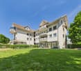 • multi story building, balconies, modern design, large windows, landscaped garden