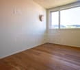 • empty room, large glass door leading to balcony, wooden floor, windows letting in sunlight