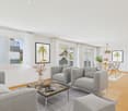 • living room with gray walls, wooden floor, glass table, couch, white carpet, dining table, balcony