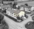 • Modern design multistory residential building, raised ground floor, windows with shutters, parking, two entrance ways.
