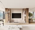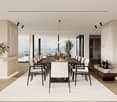 • modern open plan living and dining room with marble flooring, large windows, white modern kitchen, balcony