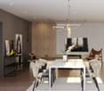 • Open-concept living and dining area with large windows overlooking a balcony and scenic view. The space features a modern, minimalist design with a gray sofa, a dining table with beige chairs, and circular pendant lights. The room has hardwood floors and