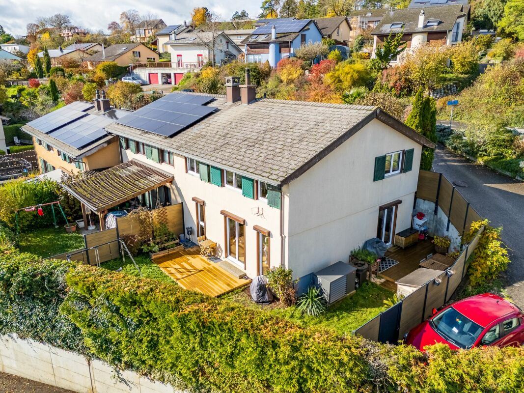 Exclusivité BARNES Yverdon !Construite en 2014, cette villa mitoyenne combine modernité, confort et fonctionnalité. Les espaces ont été soigneusement pensés pour offrir à la fois convivialité et intimité, avec un séjour lumineux donnant accès direct au jardin, ainsi qu'une cuisine contemporaine, parfaitement aménagée et pensée dans les moindres détails. Fonctionnelle et pratique, elle séduira sans aucun doute les amoureux de la gastronomie et les fins cordons-bleus. l'étage, les chambres accueillantes offrent un bel espace nuit, dont une suite parentale avec salle d'eau privative et dressing.Les combles, déjà aménagés en espace bureau et salle de cinéma, peuvent facilement se transformer en salle de jeux pour les enfants ou en grande suite parentale selon les besoins.Le rez inférieur, entièrement exploité, propose une buanderie, une cave/atelier idéal pour les bricoleurs, ainsi qu'une pièce modulable qui pourra faire office de chambre d'amis, salle de jeux ou espace de rangement supplémentaire. l'extérieur, un cadre de vie agréable vous attend : une superbe terrasse en bois d'Accoya, à la fois élégante et facile d'entretien, prolonge la pièce de vie. Le jardin verdoyant, sans vis-à-vis, est agrémenté d'un trampoline et d'un bel espace de détente pour toute la famille.Côté technique, la maison bénéficie de matériaux de qualité, ainsi que de panneaux solaires thermiques et photovoltaïques, garantissant un confort moderne et une consommation énergétique optimisée.Trois places de parc privatives avec borne électrique et un cabanon viennent compléter ce bien.Une opportunité rare, prête à accueillir une nouvelle famille dans un cadre de vie privilégié, alliant praticité, confort et plaisir de vivre au quotidien.