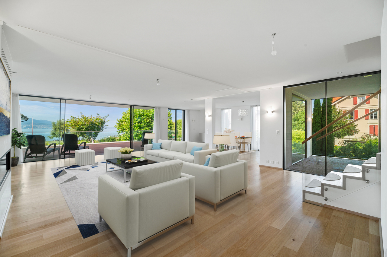 A mi-chemin entre Pully et Lutry, ce superbe appartement en duplex se situe dans une résidence élégante, en seconde ligne du lac. Il bénéficie d'un beau jardin avec accès direct au Léman et d'un emplacement privilégié, à quelques pas du port de Paudex, des commerces, des transports publics et des écoles internationales.L'appartement séduit par son style contemporain, ses volumes généreux, ses finitions soignées et ses larges baies vitrées qui s'ouvrent sur le jardin invitant à profiter pleinement de ce cadre exceptionnel.Réparti sur deux niveaux, ce 2 pièces offre une surface utile de 304 m². Il comprend 5 chambres et 5 salles de bains, dont un deux pièces indépendant, idéal pour accueillir en toute autonomie.A l'extérieur, une grande terrasse de 77m² et un jardin paysagé de 447m² avec accès sécurisé au lac prolongent l'espace de vie.Ce bien d'exception dispose d'une salle de sport, d'une cave à vin, d'un espace de rangement ainsi que d'un garage box pour quatre véhicules. Deux places extérieures complètent l'offre. Tous les stationnements sont proposés en supplément du prix de vente. La reprise d'une place d'amarrage dans port de Paudex, peut-être envisagée.Halfway between Pully and Lutry, this superb duplex apartment is located in an elegant residence on the second line to the lake. It benefits from a beautiful garden with direct access to Lake Geneva and a privileged location, just a few steps from the port of Paudex, shops, public transport and international schools.The apartment's contemporary style, generous volumes, meticulous finishes and large picture windows opening onto the garden invite you to take full advantage of this exceptional setting.Spread over two levels, this 2-room apartment offers 304 m² of floor space. It features 5 bedrooms and 5 bathrooms, including a separate two-bedroom apartment ideal for independent living.Outside, a large 77m² terrace and a 447m² landscaped garden with secure access to the lake extend the living space.This exceptional property has a gym, wine cellar, storage space and a garage for four vehicles. Two outdoor parking spaces complete the offer. All parking is available at an additional cost. A mooring space in the port of Paudex could also be considered