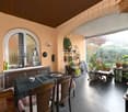 • spacious balcony, large windows, modern white seating, table, beautiful view of the ocean and mountains