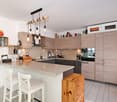• Kitchen with island, modern cabinets, marble countertops, gas range, microwave, refrigerator, dishwasher, wooden stools, dining table