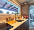 • modern terrace, wooden table and chairs, large sliding doors, wooden beams, wooden ceiling, garden view