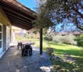 • A tiled patio with a table and chairs, an umbrella, and potted plants. Behind the patio is a garden with green grass, trimmed hedges, and a small white sphere. Beyond the garden is a building with several windows, balconies, and awnings.