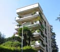 • modern building with a black exterior elevator shaft, raised ground floor, balcony