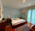 • bed, wooden flooring, white walls, large window with balcony access, built-in wardrobe, bedside tables, lamps