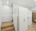 • The image shows a modern apartment interior with a green accent wall, a built-in wardrobe, a white bench, and hardwood flooring. The room appears to be an entryway or hallway leading to other rooms in the apartment.