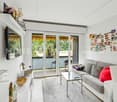 • A large glass windows with a view of the outside, L-shaped sofa, TV, rug, chairs, table, round table, side table, dining area