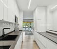• Modern kitchen with light-colored cabinets, marble-like countertops, open shelving, and various kitchen appliances and accessories such as a coffee maker, toaster, and decorative items.