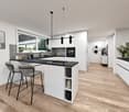 • Open-plan kitchen with modern island, white cabinets, wooden floors, large windows, balcony, views