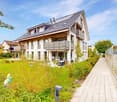 • Modern apartment building with balconies, located in a quiet area with a small garden in front, driveway paved with gravel.