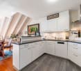 • Kitchen: Large open plan kitchen, modern cabinetry, large island with wine cooler, appliances including oven, dishwasher and washing machine, central lighting, wooden flooring