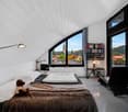 • empty attic room, white walls, sliding glass doors leading to terrace, wooden floor