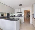 • modern open kitchen, round dining table, white kitchen cabinets, round ceiling light, large window, dishwasher