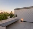 • Modern architecture building, 5 floors, balconies, greenery, sloped roof, windows, plants, outdoor seating