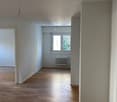 • empty room with white walls, ceiling lights, wooden floor, large window