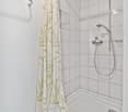 • Modern bathroom with marble-like tiles, a white sink vanity with a black countertop, a shower enclosure, and built-in storage cabinets.