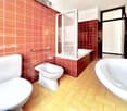 • Bathroom, bathtub with shower attachment, tiled walls, decorative flowers, faucets