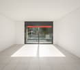 • Spacious room with large sliding glass doors, white walls, and tile flooring. The room has a minimalist and modern design aesthetic.