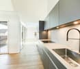• Modern kitchen with white walls, wooden floor, beige cabinets, black countertops, integrated oven, and two windows