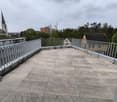 • Balcony with wooden floor, steel railings, a bench, potted plants with flowers and view of the city