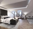 • Master bedroom: grey headboard, white sheets, 2 nightstands, glass doors, mirrored wall, white walls, wooden floor