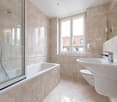 • white tiled walls and floors, bathtub, sink, mirror, toilet roll, shower area visible