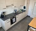 • A kitchen with a wooden dining table and chairs, a radiator, a window, and a potted plant on the table.