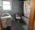 wood and brick house, two-story, metal railing balcony, storage box, picnic table, parked car