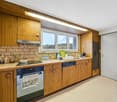 • Open kitchen concept, modern design, wooden countertops, hanging lamps, multiple modern chairs around the table