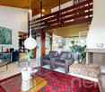 • Dining room with wooden dining table and chairs, pendant lamp, cabinet, steel railings, folding chair
