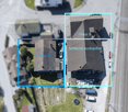• 2-story building, white walls, red tiled roof, green shutters, grassy yard, small shed, fenced area