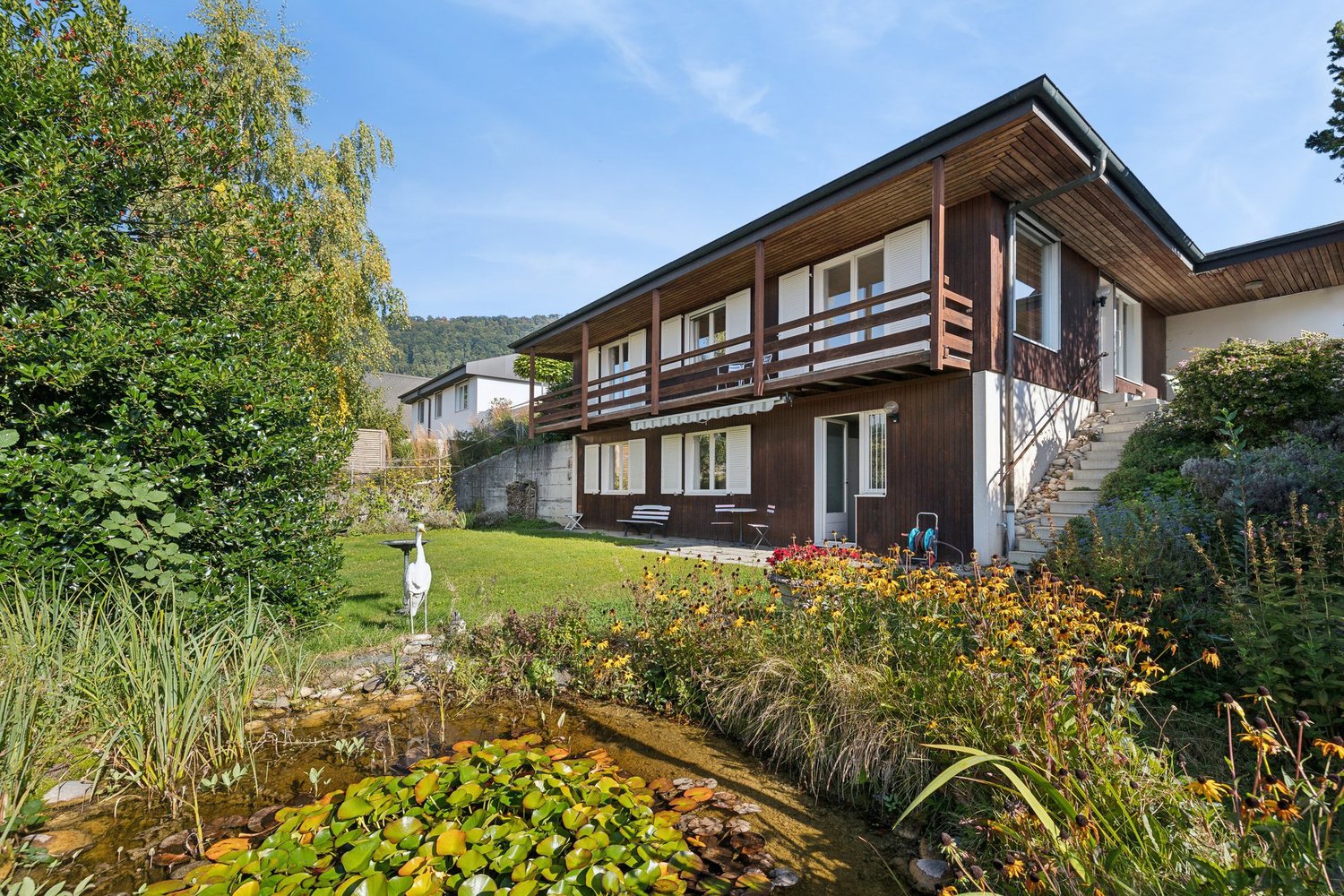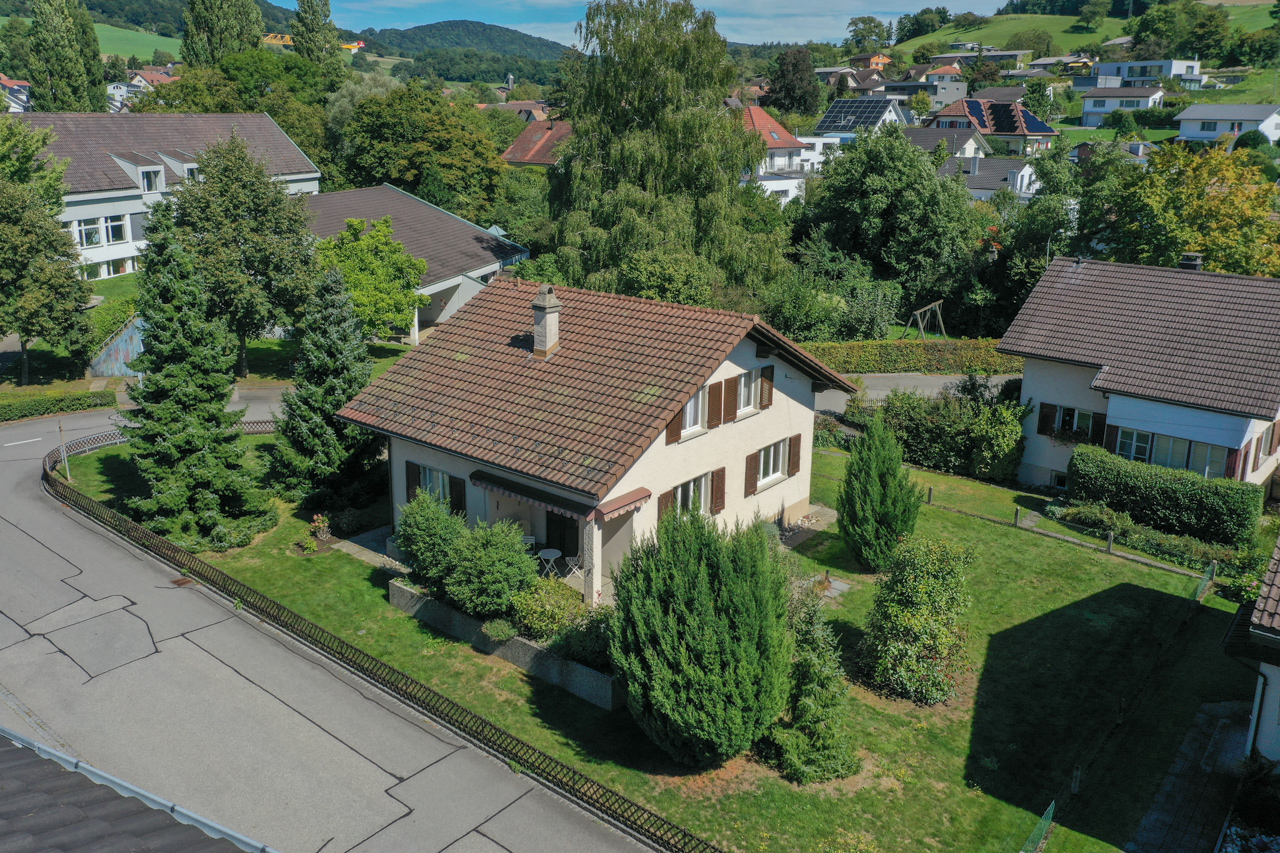 Einzigartiger "Adlerhorst", weil weit erhöht an oberster Hanglage und seitlich direkt an der Waldgrenze, mit Terrasse und GARTEN, als untypische Besonderheit bei Terrassenhäusern. So präsentiert sich die Attika-Residenz 6.5++ Zi-Terrassenhaus (5.5 Zi, gem. GBA) an einer absolut ruhigen Lage mit fantastischer Aussicht über die Aare-Landschaft und mit Panorama-Weitblick bis zu den Alpen, notabene unverbaubar! Die südlich ausgerichtete Sonnenterrasse und darüber hinaus, der von der Morgen- und Mittagssonne verwöhnte und abendlich angenehm schattige Ost-Garten mit Wiese bieten, ohne Einsicht von aussen, höchste Privatsphäre so geniessen Sie die Feierabende und Wochenenden wie Ferien. Die Lage nahe Aarau, macht das Terrassenhaus auch für Pendler:innen nach Zürich, Bern oder Basel attraktiv, insbesondere auch, weil sie hier das bessere "Preis-Leistungs-Verhältnis" als in den grösseren Städten finden./ RAUMKONZEPT: Das ebenerdige TEFH, mit Schräglift im OG 7 erreichbar, bietet die gesamte nutzbare Fläche von171 m² auf derselben Etage. Das Zuhause umfasst ein Entrée mit separatem Garderobenraum, einen offenen Wohn-, Koch- und Speisebereich mit grosser Fensterfront, hohen Wohnräumen auch in den drei Schlafzimmern (ein fünftes Zimmer könnte ohne weiteres abgetrennt werden, im Grundbuch so eingetragen). Zudem stehen zur Verfügung, ein Bad en Suite mit Wanne / DU / WC und ein separates WC mit Dusche, sowie drei Nebenräume, davon ein Keller, ein Technik-/Waschraum und ein, zwar unbeheiztes, helles Zimmer (Hobby-/Allzweckraum, Büro usw.) mit Fenstertüre aber doch ein gut nutzbarer Raum. Der gesamte Wohnraum ist durch-gängig, mit hochwertigen weiss-grau marmorierten Feinsteinzeug-Bodenplatten und Bodenheizung bestückt. Ein Cheminée trägt zu einem gemütlichen Ambiente bei. Die gesamte Fensterfront, sowie die Zimmer haben elektrische Rafflammellenstoren./ AUSSENBEREICH: Die Sonnenterrasse erstreckt sich auf über 120 m² und die eingezäunte Garten-Rasenfläche umfasst ca. 80 m². Auf der Sonnenterrasse vor dem ca. 18 m² überdachten, nach innen versetztem gedecktem Sitzplatz, sorgt eine Sonnenmarkise für Schatten; dieser Bereich könnte zu einem Wintergarten z.B. mit 26 m² umgebaut werden. Im Erdgeschoss befinden sich in der Einstellhalle, zwei grosszügig bemessene PW-Parkplätze. Oberhalb des TEFH im OG 7, befindet sich eine Wiese und Wald an Hanglage dieses Grundstück, mit dem sich darauf befindenden Holzschopf, gehört der gesamten Stockwerkeigentümerschaft, wobei das doppelstöckige Holzhaus vom Eigentümer dieser inserierten Wohnung im OG 7, mit entsprechender Bewilligung, alleinig als Lager und Künstleratelier genutzt wurde - evtl. STEWG-Neuverhandlung notwendig! / STATUS: Das TEFH ist nach einer überschaubaren Renovation einzugsbereit; diese erstreckt sich z.B. über Malerarbeiten, die drei Dachfensterhauben und den Ersatz der Elektroheizung (z.B. Wärmepumpe), sowie eine Neugestaltung der Terrasse. Die Küche, der Wohnbereich sowie die Nasszellen wären intakt-gut. Je nach individuellen Bedürfnissen sowie gewünschtem Modernisierungsgrad lässt sich das Objekt ganz nach Geschmack und Budget in ein persönliches Bijoux verwandeln./ LAGE: An der Stadtgrenze zu Aarau, am östlichen Dorfrand von Erlinsbach AG, weit erhöht mit bester Aussicht am Sonnenhügel. Zur Bushaltestelle sind es ca. 700 m, zum Einkauf (Denner Express) 950 m und zu den Schulanlagen 1.1 Km. Die Aarauer Altstadt, Einkaufszentren, SBB-Bahnhof, Spitäler sind 2 - 3 Km entfernt, zu Fuss in ca. 30 Min., mit dem ÖV (Bus) 12 Min. und mit dem Auto in 7 Min., der A1-Autobahnzubringer T5 ist 6.5 Km entfernt und in ca. 8 Min. erreichbar. Aarau weist als Kantonshauptstadt Zentrumsfunktionen auf, wie Bezirksschule, Kantonsschule, Kinos, Theater, die wesentlichen Verkaufsgeschäfte wie Migros Coop, Denner, Aldi etc, Sport- und Kulturvereine uvm./ EINLADUNG: Die Objekt-Webseite weckt Ihr Interesse? Dann sind Sie herzlich eingeladen das Exposé zu bestellen. Nach einer
