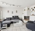 • Wooden beams, wooden flooring, sectional sofa, dining table, dining chairs, coffee table, wooden cabinet, radiator, windows with white curtains, picture frame, potted plant