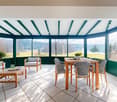 • overlooking the terrace with outdoor furniture, glass doors, wooden flooring, table with chairs
