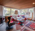• Cozy living room with wooden paneled walls and ceiling, large windows, a dining area with a table and chairs, a sofa and armchairs, and various decor items such as framed artwork and a world map on the wall.
