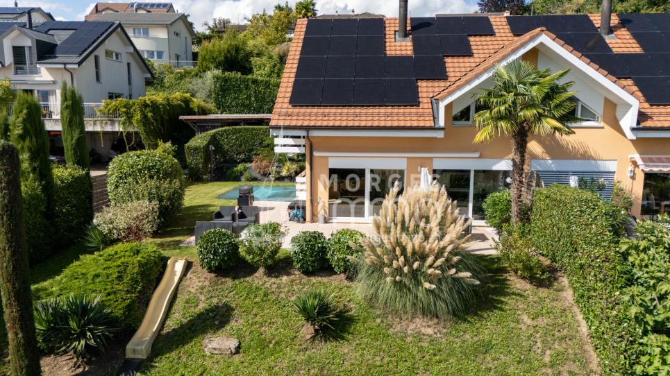 Maison mitoyenne contemporaine de 10.5 pièces au coeur de Mex (VD):Située dans la paisible commune de Mex, à seulement quelques minutes de Lausanne et Crissier, cette maison mitoyenne de 10.5 pièces séduit par son architecture contemporaine, ses volumes généreux et son environnement verdoyant. Construite en 2019, elle bénéficie d'un bout de parcelle privatif d'environ 890 m², offrant confort moderne, convivialité et qualité de vie dans un cadre résidentiel recherché, en lisière de forêt.Découvrez une maison familiale lumineuse et fonctionnelle:Développant une surface habitable nette d'environ 240 m² et une surface utile totale de 350 m², cette propriété offre une distribution harmonieuse sur trois niveaux.Le rez-de-chaussée accueille un vaste espace de vie de près de 47 m², composé d'un séjour lumineux et d'une grande cuisine ouverte, entièrement équipée et conviviale, donnant accès à une belle terrasse d'environ 50 m². Une chambre de 14 m² et une salle de bains avec douche complètent ce niveau.À l'étage, sous les combles, se trouvent deux spacieuses chambres de plus de 20 m² chacune, ainsi que deux autres chambres de 14 m² et 12 m². Cet étage est complété par une salle de bains disposant à la fois d'une douche et d'une baignoire.Le sous-sol offre une grande pièce modulable d'environ 46 m² pouvant être aménagée en salle de jeux, bureau, espace détente ou home cinéma selon les besoins, ainsi qu'une buanderie et une cave.Un cadre de vie paisible et verdoyant:Implantée sur un bout de parcelle privatif d'environ 890 m² orienté côté forêt, cette maison bénéficie d'une agréable intimité et d'un environnement calme. Le jardin, soigneusement aménagé, accueille également une piscine de 8 x 4 mètres, idéale pour profiter pleinement des beaux jours.Le quartier, familial et résidentiel, se situe à proximité immédiate des écoles, du coeur du village et des commodités principales.La commune de Mex séduit par son atmosphère champêtre, tout en offrant une accessibilité remarquable vers Lausanne, Crissier ou Morges. Un équilibre idéal entre vie de village et proximité urbaine.Mobilité et performance énergétique:Cette propriété profite d'une excellente efficience énergétique grâce à sa pompe à chaleur et ses panneaux solaires, combinés à un chauffage au sol intégral. L'isolation performante garantit un confort optimal tout au long de l'année.Deux places de parc intérieures, situées dans le garage souterrain commun aux deux paires de maisons mitoyennes, complètent l'ensemble.Une maison idéale pour les familles:Cette maison allie modernité, luminosité et convivialité dans un cadre serein et verdoyant. Ses beaux volumes, ses finitions contemporaines et sa piscine privée en font une adresse parfaite pour les familles à la recherche d'un lieu de vie chaleureux et harmonieux, à deux pas de Lausanne.Zeitgemässes 10.5-Zimmer-Reihenhaus im Herzen von Mex (VD):Im ruhigen Dorf Mex, nur wenige Minuten von Lausanne und Crissier entfernt, befindet sich dieses moderne 10.5-Zimmer-Reihenhaus. Es überzeugt durch seine zeitgenössische Architektur, grosszügigen Räume und die grüne Umgebung. Das 2019 erbaute Haus profitiert von einem privaten Grundstücksteil von ca. 890 m² und vereint modernen Komfort, Geselligkeit und Lebensqualität in einem begehrten Wohnquartier am Waldrand.Entdecken Sie ein helles und funktionales Familienhaus:Mit einer Nettowohnfläche von rund 240 m² und einer gesamten Nutzfläche von 350 m² bietet dieses Haus eine harmonische Raumaufteilung auf drei Ebenen.Das Erdgeschoss verfügt über einen grosszügigen Wohnbereich von etwa 47 m² mit offenem, komplett ausgestatteten Küchenbereich, der sich zu...