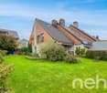 • Aerial view of a residential neighborhood with several houses and green fields. Houses have different styles and sizes, some with solar panels on the roofs.