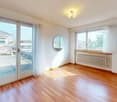 • Empty room, white walls, white flooring, radiators, windows with a view outside