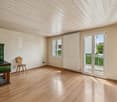 • empty room, wooden floor, white wall, large glass windows, wooden ceiling